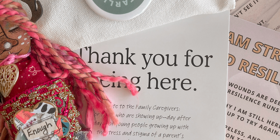Our 1:1 and group peer sessions are a space for family caregivers to pack a free hope kit for a youth in your life, ask question, and get help navigating supports while caregiving for a youth